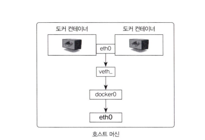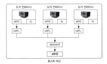 eth0은 공인 IP 또는 내부 IP가 할당되어 실제로 외부와 통신할 수 있는 호스트의 네트워크 인터페이스다. veth로 시작하는 인터페이스는 컨테이너를 시작할 때 생성됐으며, 각 컨 테이너의eth0과 연결됐다.veth인터페이스뿐 아니라docker0이라는 브리지도 존재한다.docker0브리지는 각veth인터페이스와 바인딩돼 호스트의eth0인터페이스와 이어주는 역할을 한다.