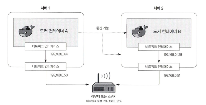 위 예시에서 컨테이너 A는 서버 2와는 통신할 수 있지만. 서버 1과는 통신할 수 없다.
