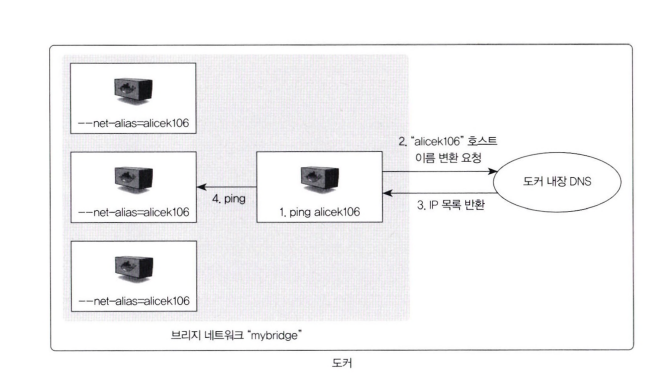 127.0.0.11이다. mybridge라는 이름의 네트워크에 속한 3개의 컨테이너는 run으로 생성 할 때--net-alias옵션에 alicekl06이라는 값을 입력했으며, 이 컨테이너의 IP는 DNS 서버에 alicekl06이라는 호스트 이름으로 등록된다.- mybridge 네트워크에 속한 컨테이너에서 alicekl06이라는 호스트 이름으로 접근하면 DNS 서버 는 라운드 로빈 방식을 이용해 컨테이너의 IP 리스트를 반환한다.