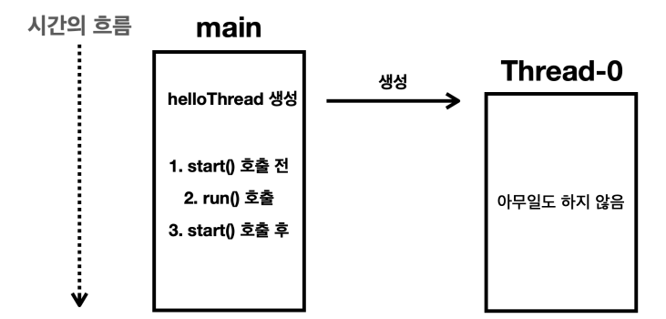 HelloThread스레드 객체를 생성하고start()메서드를 호출한다. start()메서드는 스레드를 실행하는 아주 특별한 메서드이다.start()를 호출하면HelloThread스레드가run()메서드를 실행한다.