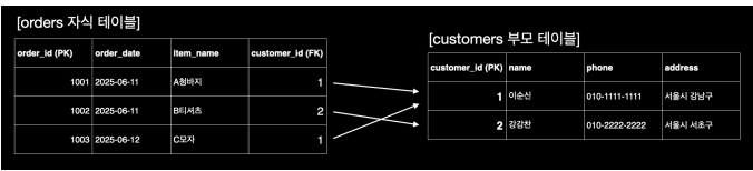 customer_id(FK) 값이 99가 입력된다고 가정해보자.customers테이블에는 99번 고객 번호가 없다. 이런 경우 데이터베이스는 데이터의 입력을 막는다. (오류가 발생한다.)