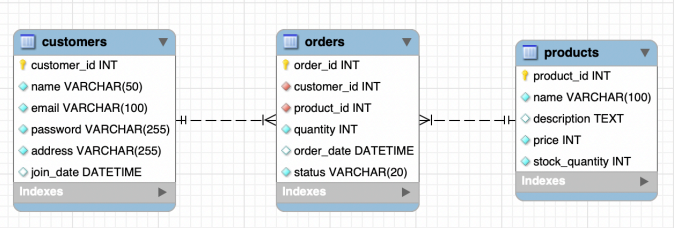 orders.customer_id → customers.customer_id,orders.product_id → products.product_id관계 설정 - ERD를 그려 테이블 관계(1:N)를 한눈에 파악