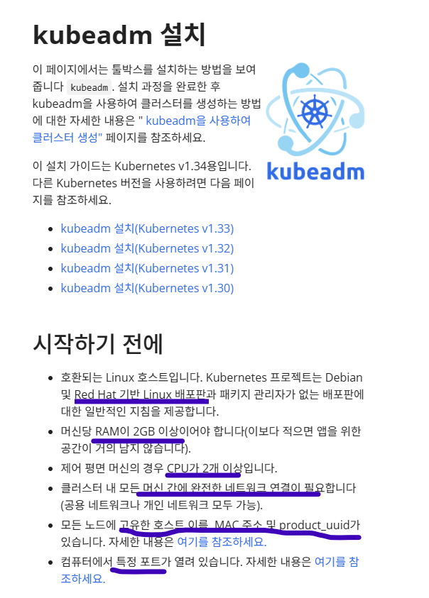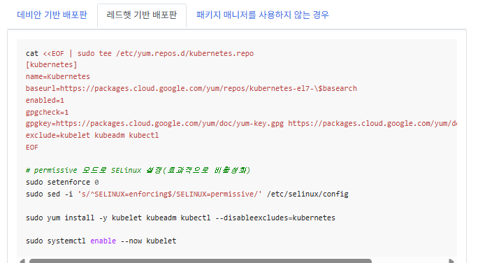 - 레드햇 배포판에서 kubeadm을 설치하는 방법을 가이드하고 있다.