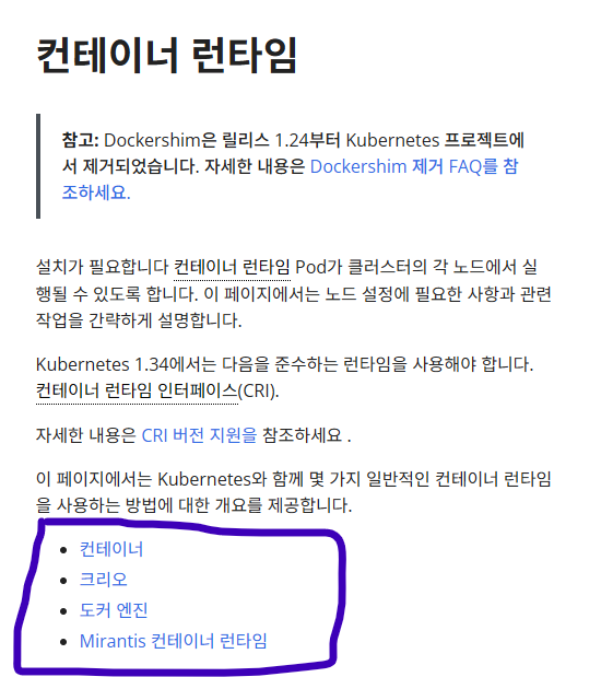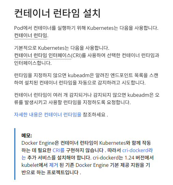 참고를 보면, 컨테이너 한 방 정리에서 봤던 것처럼 도커 엔진이 CRI를 구현(만족)하지않고, 1.24부터는 cri-dockerd를 사용한다고 되어있다.