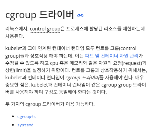 쿠버네티스에서 systemd로 설정했으면, 컨테이너 런타임도 systemd로 설정을 해줘야 한다는 내용이다.