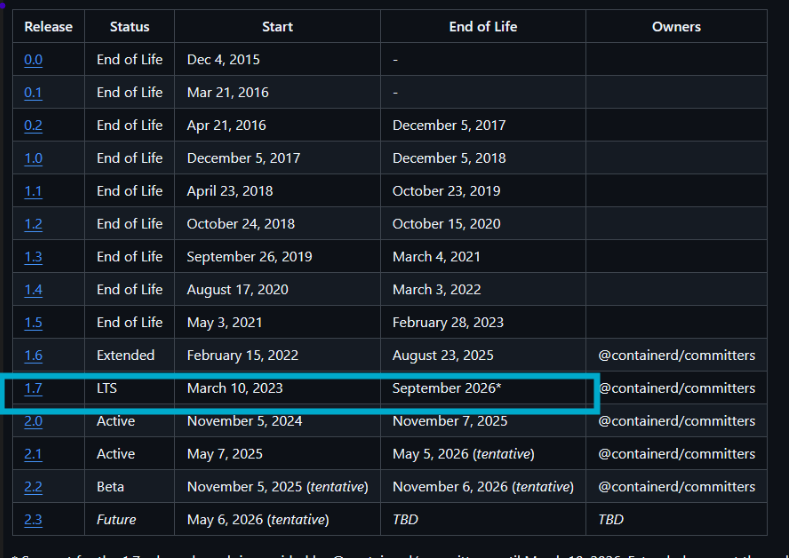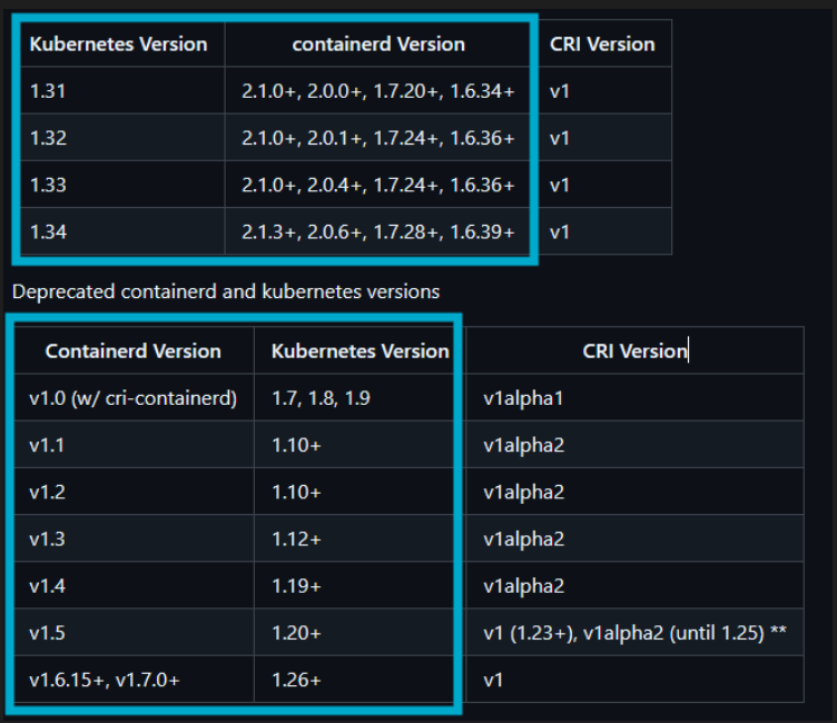 우리는 1.27 을 사용하기 때문에, 해당 사이트의 Deprecated containerd and kubernetes versions 쪽을 확인하면 된다.