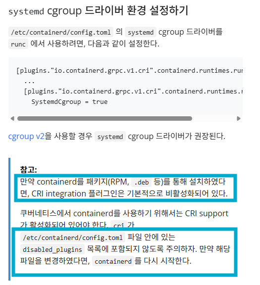 만약 패키지를 통해서 설치했다면, CRI가 비활성화 되어있을 것이기 때문에 config 파일 안에서 disabled_plugins 목록에 포함되지 않도록 주의하고, 변경되었다면, containerd를 재시작하라고 한다.