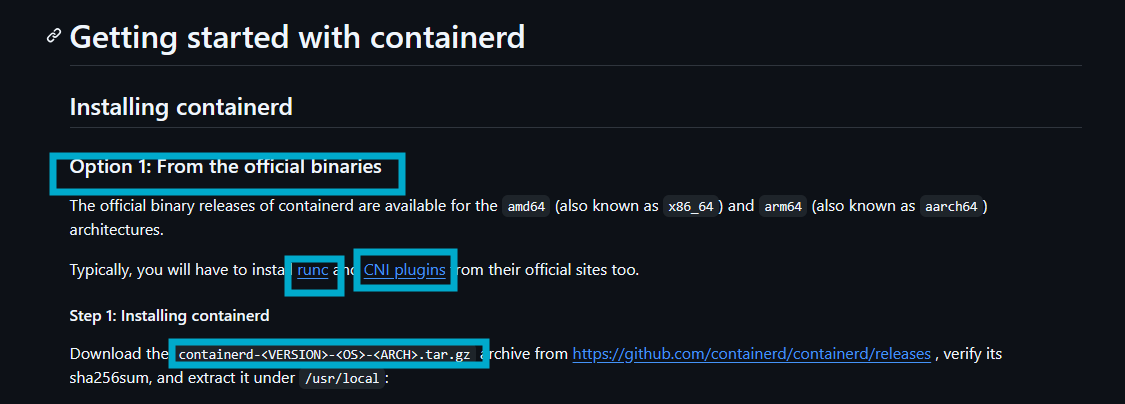 container...처럼 나오는 것 처럼 파일만 받으면 좋겠지만,runc와CNI plugins는 별도로 설치해야 한다고 한다.- 참고로 runc 는 위에서 설명했다.